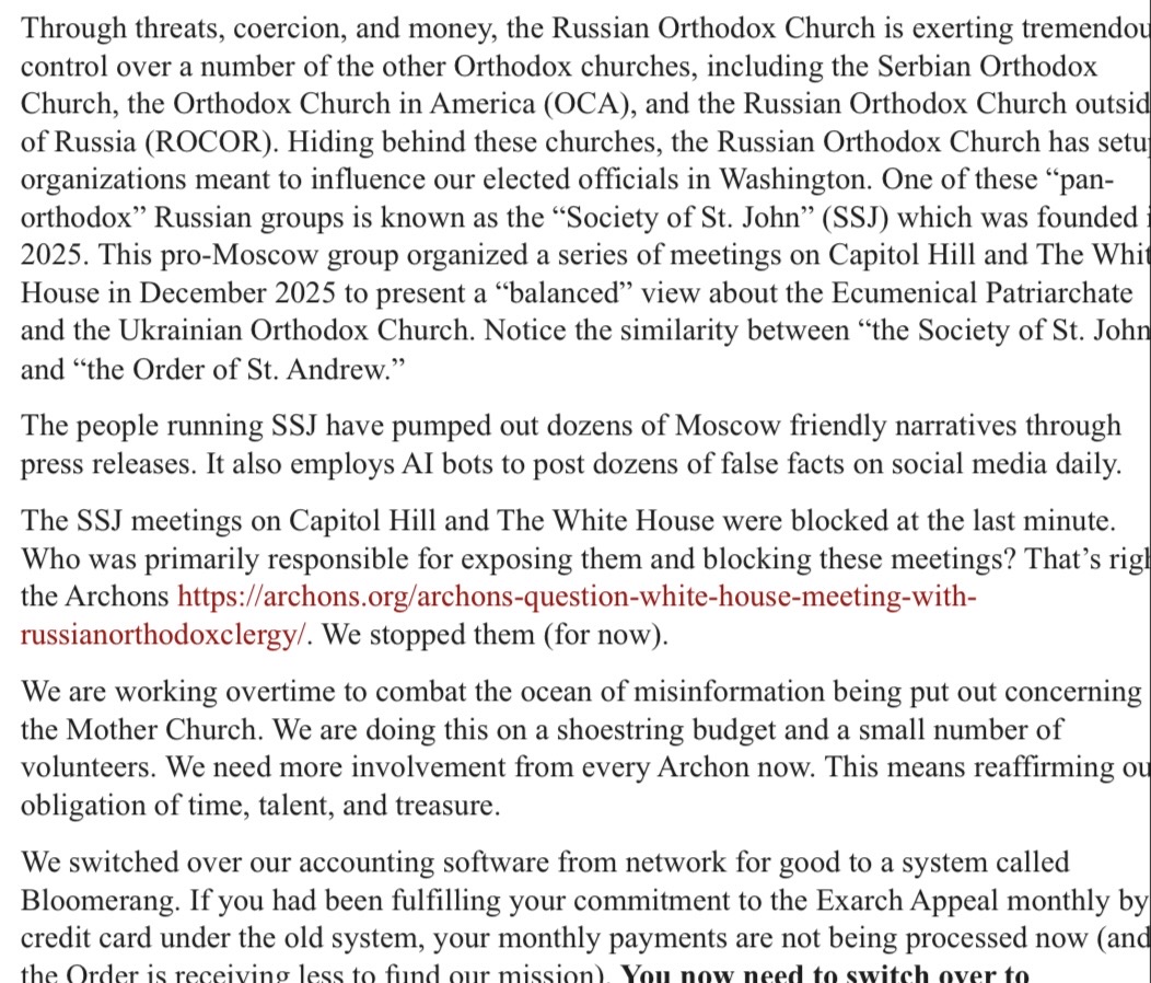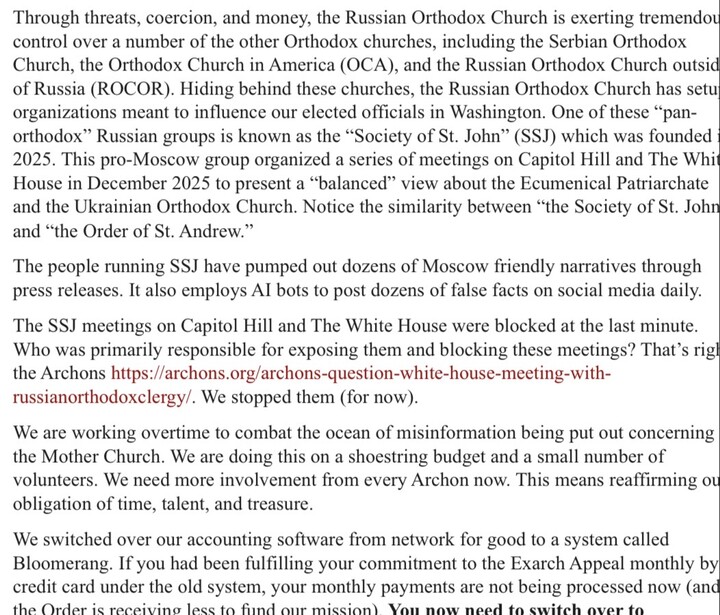 “One of these ‘pan-orthodox’ Russian groups is known as the ‘Society of St. John’ (SSJ) which was founded in 2025,” Zavitsanos writes. “This pro-Moscow group organized a series of meetings on Capitol Hill and The White House in December 2025 to present a ‘balanced’ view about the Ecumenical Patriarchate and the Ukrainian Orthodox Church. Notice the similarity between ‘the Society of St. John’ and ‘the Order of St. Andrew.’”