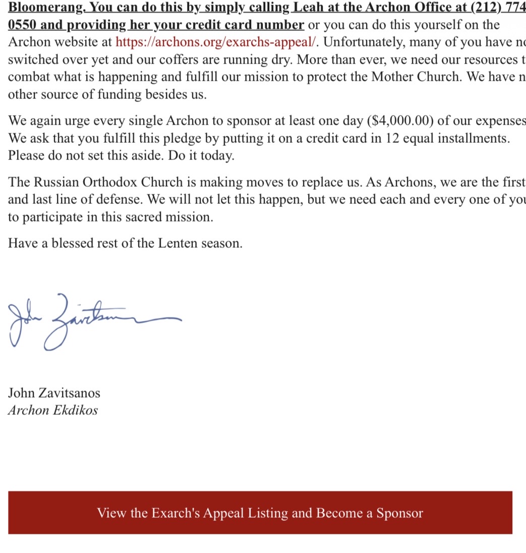We switched over our accounting software from network for good to a system called Bloomerang. If you had been fulfilling your commitment to the Exarch Appeal monthly by credit card under the old system, your monthly payments are not being processed now (and the Order is receiving less to fund our mission). You now need to switch over to Bloomerang. You can do this by simply calling Leah at the Archon Office at (212) 774 – 0550 and providing her your credit card number or you can do this yourself on the Archon website at https://archons.org/exarchs-appeal/. Unfortunately, many of you have not switched over yet and our coffers are running dry. More than ever, we need our resources to combat what is happening and fulfill our mission to protect the Mother Church. We have no other source of funding besides us.