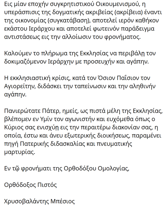 The faithful urge the Church to surround Met. Tychikos “with prayer and love,” recalling the words of St. Paisios that spiritual trials cultivate humility and true love. They conclude by addressing the hierarch directly:
