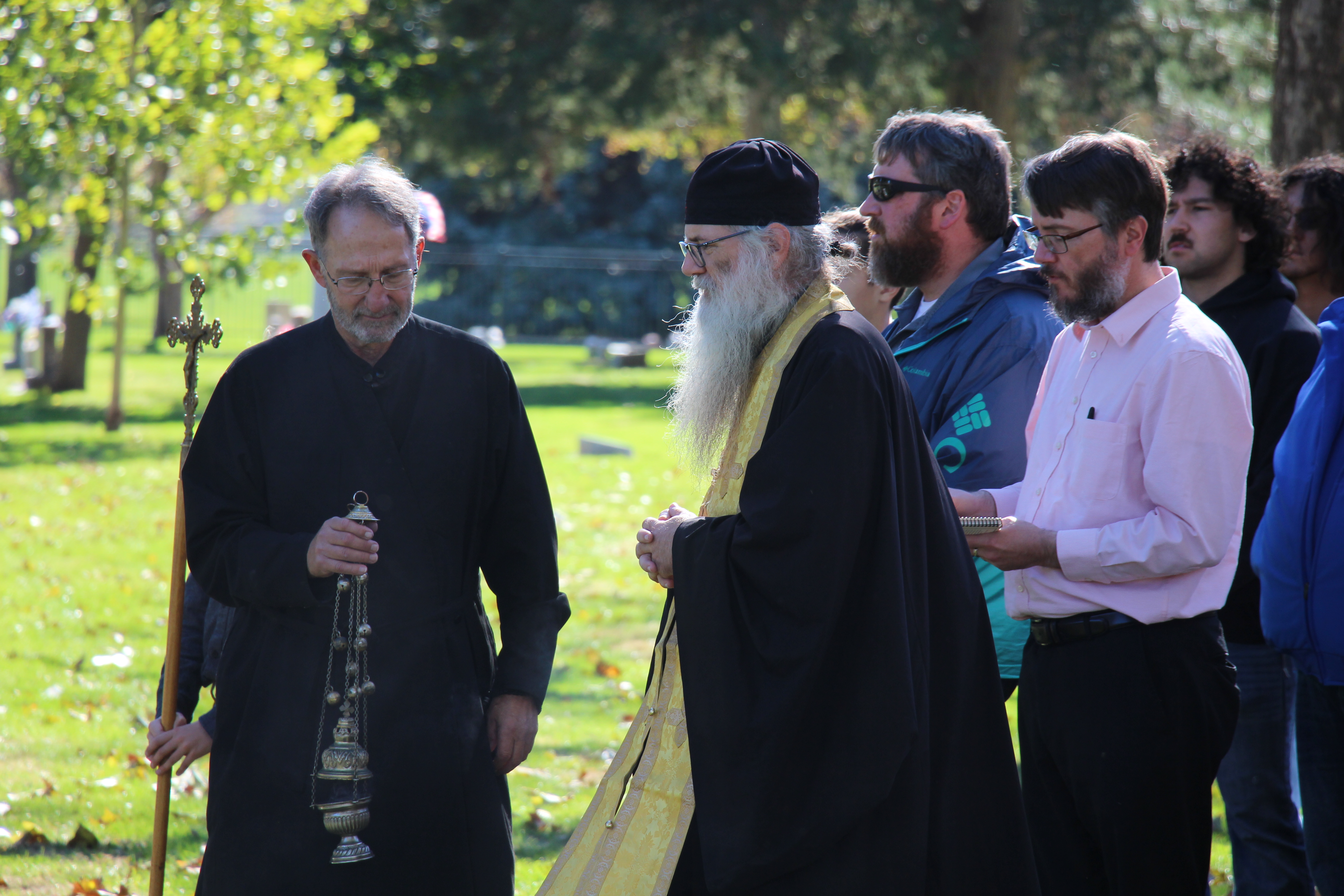 Following the Liturgy, potluck, and Sunday school at St. George this past Sunday, the faithful filed over to the Kearney Cemetery, where a black gravestone containing a white cross stands out from the rest, with the front simply saying: