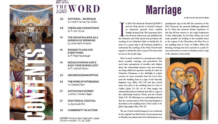 Featured articles include an editorial on marriage by Metr. Saba; "Creed and Coexistence" by Fr. John Oliver; "The Hexapsalmos as a Sermon of Sermons" by Johannes Pulkkanen; "Rediscovering God’s Easy Yoke During Lent" by Fr. Joshua Makoul; "The Work of Witnessing" by Cecelia Olson; and "Render to God Our Everything" by Fr. Peter Kavanaugh.