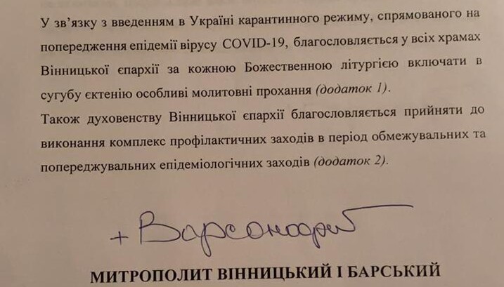 On March 13, with the blessing of Metropolitan Varsonofy (Stoliar) of Vinnytsia and Bar, the Vinnytsia Eparchy of the Ukrainian Orthodox Church announced the adoption of measures in connection with the announcement of quarantine due to the spread of coronavirus.
