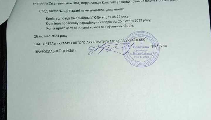The authorities of the Khmelnytsky region illegally re-registered the religious community of the Ukrainian Orthodox Church in the village of Kolybayivka, Kamyanets-Podilsky district, in favor of the OCU. Archpriest Tarasy Kavulya, rector of the Archangel Michael Church, told the UOJ about this.