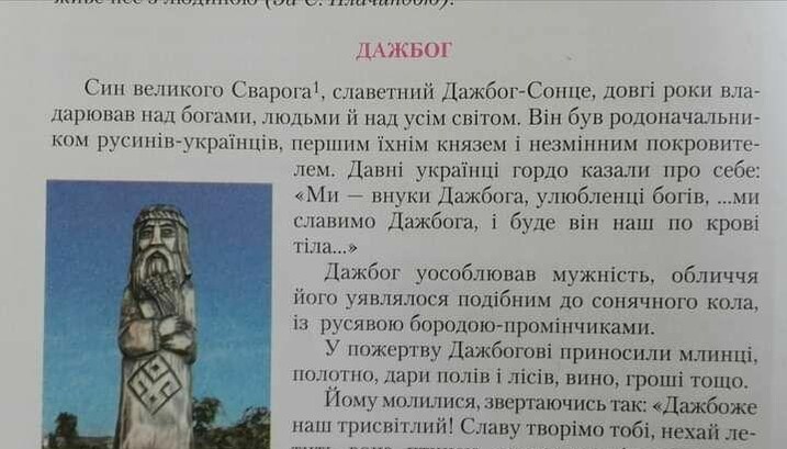 This is a textbook on Ukrainian literature for the fifth grade, in which, in the section “Myths and Legends of Ancient Ukrainians”, children are invited to read the “prayer” with which “ancient Ukrainians” addressed the pagan Dazhbog.