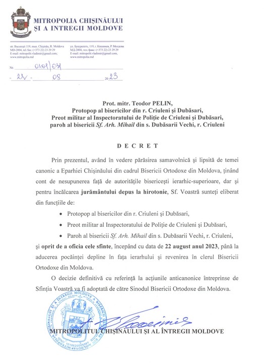 The priests were relieved of the rectorship in the churches where they had served before and deprived of their right to perform divine services "until they fully repent to the hierarchy and return to the clergy of the Orthodox Church of Moldova".