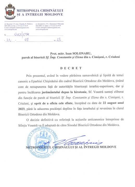 The decrees signed by Metropolitan Vladimir say that the priests are banned from ministry "in connection with the non-canonical withdrawal from the Chisinau Eparchy of the Orthodox Church of Moldova, disobedience to the highest church authorities, as well as for the violation of the oath given at ordination".