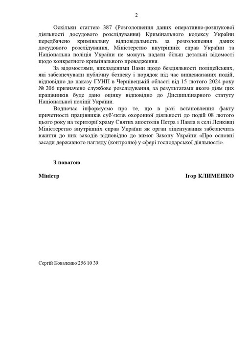 Member of Parliament Artem Dmytruk reported that he had received a response from the Minister of Internal Affairs to his parliamentary inquiry regarding the attempted seizure of the temple and assault on members of the Sts. peter and Paul community in Lenkivtsi, as stated by the MP in his Telegram channel.