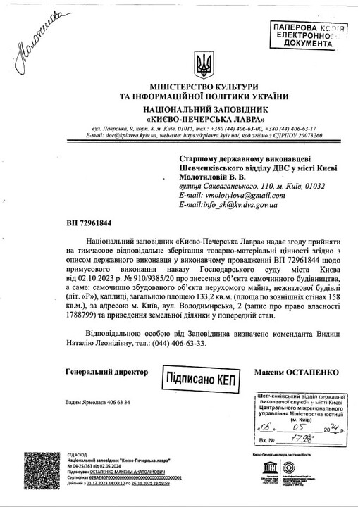 As for the letter from the reserve, the director of the reserve, Ostapenko, "agrees to temporarily accept material values" from the Tithe Church after it is destroyed.