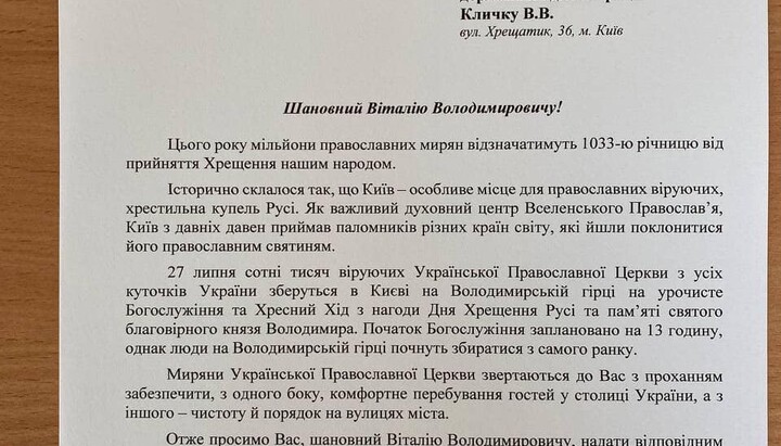 The “Miriane” division in Kyiv sent a request to the city mayor to assist in the preparation and conduct of the Cross Procession dedicated the Baptism of Rus holiday.