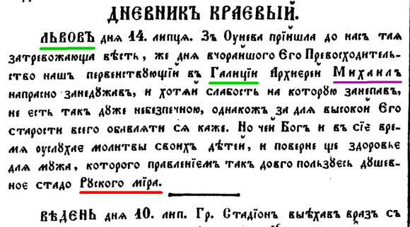 So, in the "Галичо-Рускій Вѣстникъ", which was published in Lviv in July 1849, the author of the article reported on the illness of the Greek Catholic Metropolitan Mikhail Levitsky (head of the UGCC from 1816 to 1858 – Ed.) and wished him recovery to further “care for the flock of the Russian world” (the digitized version of the newspaper is presented on the Calaméo service, a note about the Uniate Metropolitan – on page 8 – Ed.).