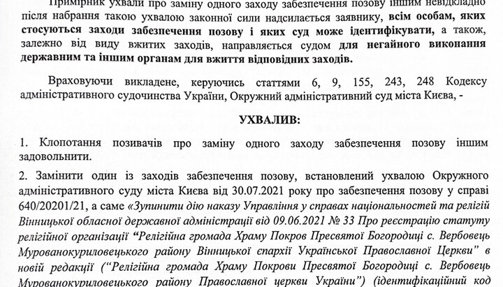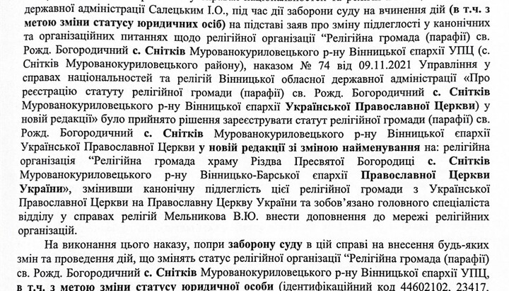 The court ruled to terminate the decree of the Department for Religions and Nationalities of the Vinnytsia Regional State Administration of June 9, 2021 No. 33 on the re-registration of the Verbovets village community from the UOC to the OCU, and the records and entries in the Unified State Register of Legal Entities made on the basis of this decree, as well as terminate decree No. 74 of November 9, 2021, on the registration of the statute of the OCU community in the village of Snitkiv. The court prohibited state and local authorities from obstructing the communities of the Ukrainian Orthodox Church in the villages of Verbovets, Snitkiv and Bakhtin.